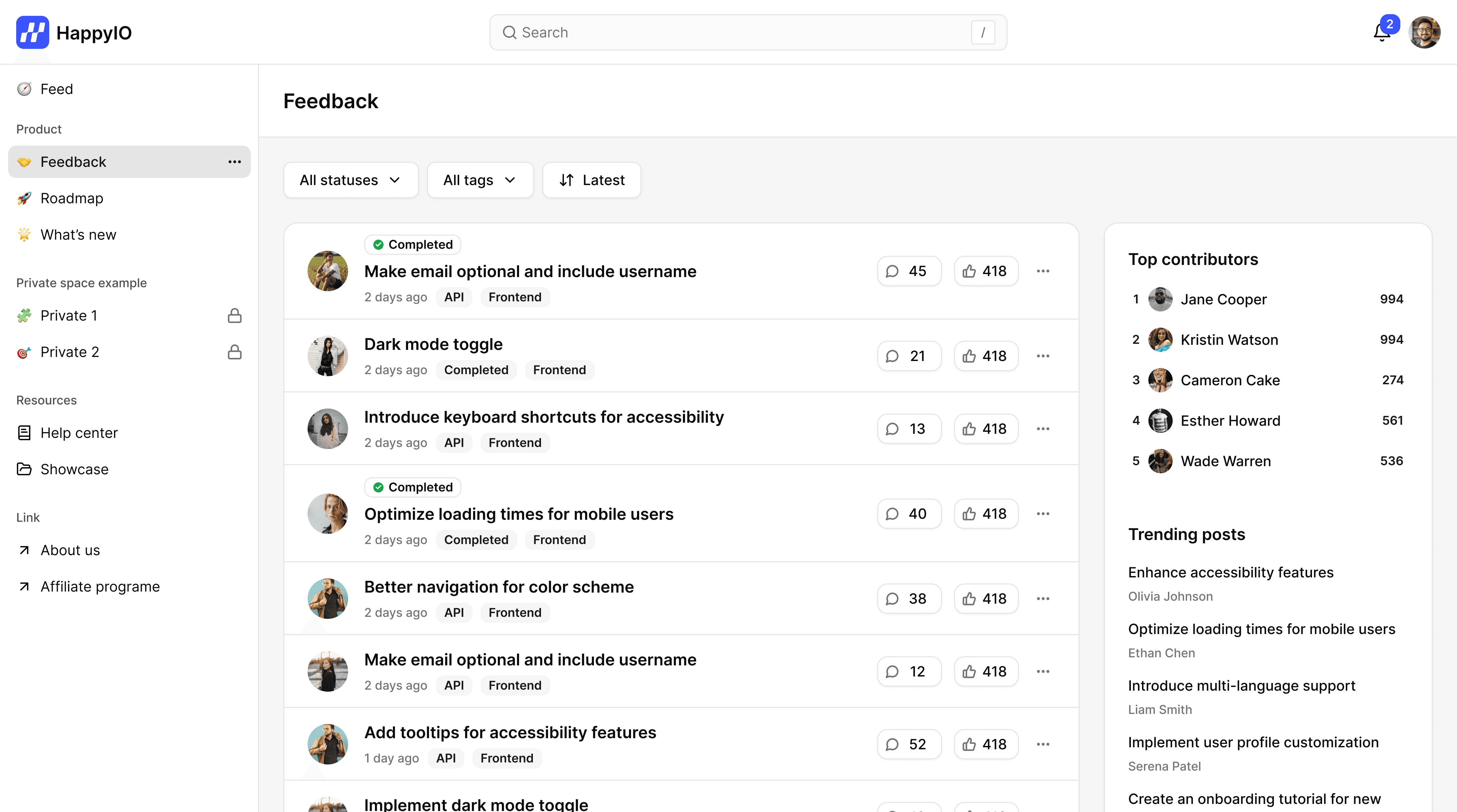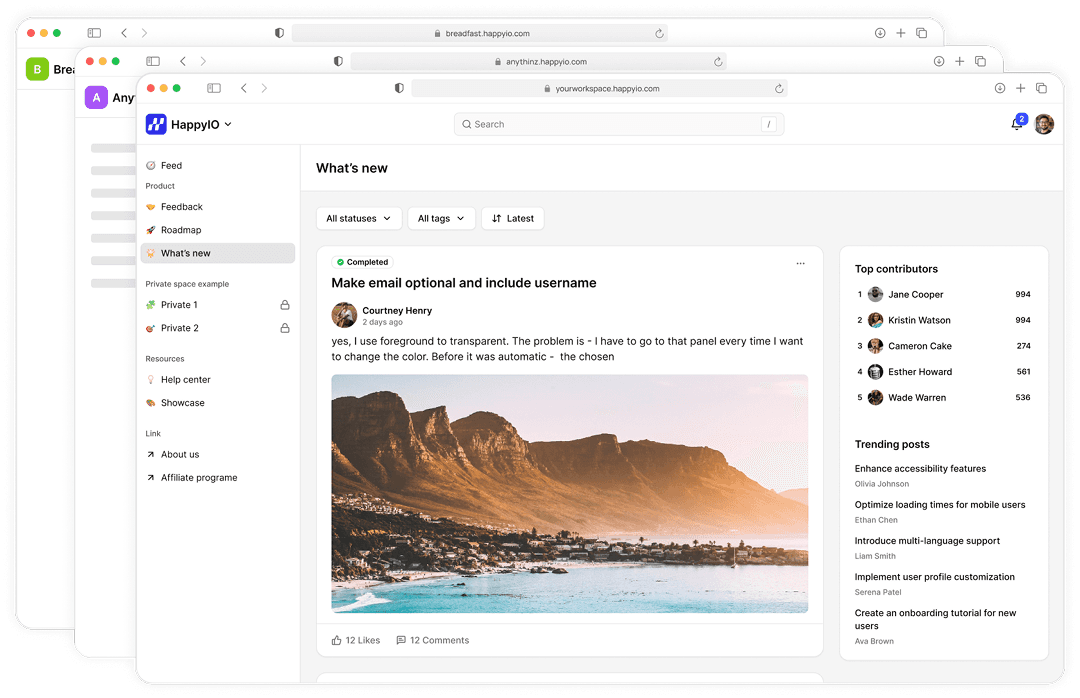 Collect ideas, bug reports, and feature requests in one place. Users vote, you prioritize, and followers auto-get updates when things ship.